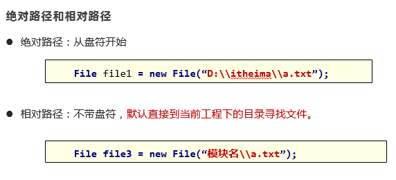 1 package com.itheima.d1_file; 2 3 import java.io.File; 4 5 /** 6 目标:学会创建File对象定位操作系统的文件(文件 文件夹的) 7 */ 8 public class FileDemo { 9 public static void main(String[] args) { 10 // 1、创建File对象(指定了文件的路径) 11 // 路径写法: D:\resources\xueshan.jpeg 12 // D:/resources/xueshan.jpeg 13 // File.separator 14 // File f = new File("D:\\resources\\xueshan.jpeg"); 15 // File f = new File("D:/resources/xueshan.jpeg"); 16 File f = new File("D:" + File.separator+"resources"+ File.separator +"xueshan.jpeg"); 17 long size = f.length(); // 是文件的字节大小 18 System.out.println(size); 19 20 // 2、File创建对象,支持绝对路径 支持相对路径(重点) 21 File f1 = new File("D:\\resources\\beauty.jpeg"); // 绝对路径 22 System.out.println(f1.length()); 23 24 // 相对路径:一般定位模块中的文件的。 相对到工程下!! 25 File f2 = new File("file-io-app/src/data.txt"); 26 System.out.println(f2.length()); 27 28 // 3、File创建对象 ,可以是文件也可以是文件夹 29 File f3 = new File("D:\\resources"); 30 System.out.println(f3.exists()); // 判断这个路径是否存在,这个文件夹存在否 31 32 } 33 }