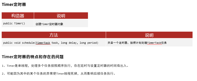 1 package com.itheima.d9_timer; 2 3 import java.util.Date; 4 import java.util.Timer; 5 import java.util.TimerTask; 6 7 /** 8 目标:Timer定时器的使用和了解。 9 */ 10 public class TimerDemo1 { 11 public static void main(String[] args) { 12 // 1、创建Timer定时器 13 Timer timer = new Timer(); // 定时器本身就是一个单线程。 14 // 2、调用方法,处理定时任务 15 timer.schedule(new TimerTask() { 16 @Override 17 public void run() { 18 System.out.println(Thread.currentThread().getName() + "执行AAA~~~" + new Date()); 19 // try { 20 // Thread.sleep(5000); 21 // } catch (InterruptedException e) { 22 // e.printStackTrace(); 23 // } 24 } 25 }, 0, 2000); 26 27 timer.schedule(new TimerTask() { 28 @Override 29 public void run() { 30 System.out.println(Thread.currentThread().getName() + "执行BB~~~"+ new Date()); 31 System.out.println(10/0); 32 } 33 }, 0, 2000); 34 35 timer.schedule(new TimerTask() { 36 @Override 37 public void run() { 38 System.out.println(Thread.currentThread().getName() + "执行CCC~~~"+ new Date()); 39 } 40 }, 0, 3000); 41 } 42 }