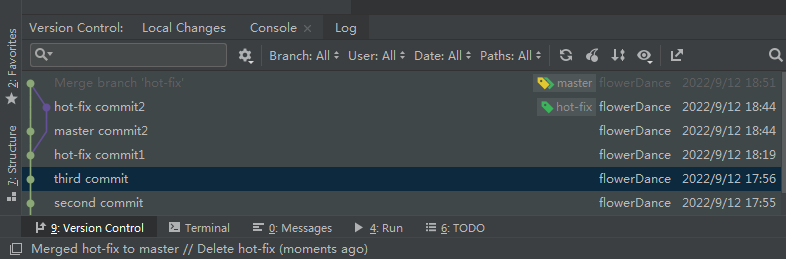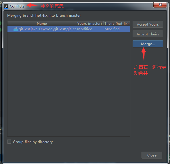 B、在master分支下,选择你要进行合并的分支,这里选择的是hot-fix,点击Merge into Current