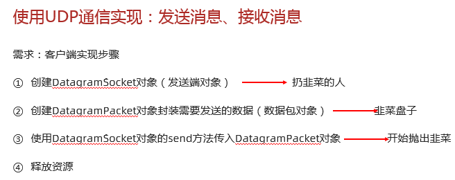 将数据源IP、目的地IP和端口以及数据封装成数据包,大小限制在64KB内,直接发送出去即可