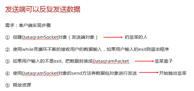 1 package com.itheima.d2_udp1; 2 3 import java.net.DatagramPacket; 4 import java.net.DatagramSocket; 5 import java.net.InetAddress; 6 import java.net.SocketException; 7 8 /** 9 发送端 一发 一收 10 */ 11 public class ClientDemo1 { 12 public static void main(String[] args) throws Exception { 13 System.out.println("=====客户端启动======"); 14 15 // 1、创建发送端对象:发送端自带默认的端口号(人) 16 DatagramSocket socket = new DatagramSocket(6666); 17 18 // 2、创建一个数据包对象封装数据(韭菜盘子) 19 /** 20 public DatagramPacket(byte buf[], int length, 21 InetAddress address, int port) 22 参数一:封装要发送的数据(韭菜) 23 参数二:发送数据的大小 24 参数三:服务端的主机IP地址 25 参数四:服务端的端口 26 */ 27 byte[] buffer = "我是一颗快乐的韭菜,你愿意吃吗?".getBytes(); 28 DatagramPacket packet = new DatagramPacket( buffer, buffer.length, 29 InetAddress.getLocalHost() , 8888); 30 31 // 3、发送数据出去 32 socket.send(packet); 33 34 socket.close(); 35 } 36 }