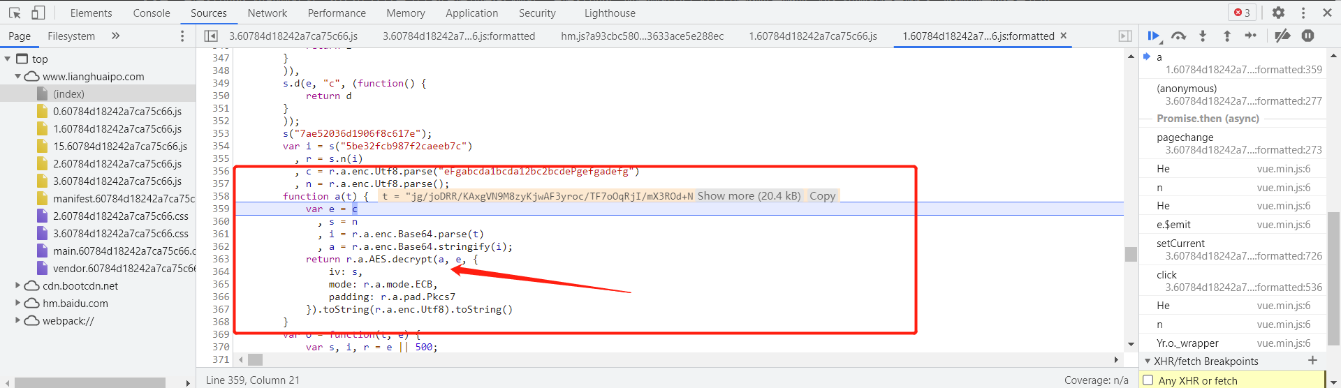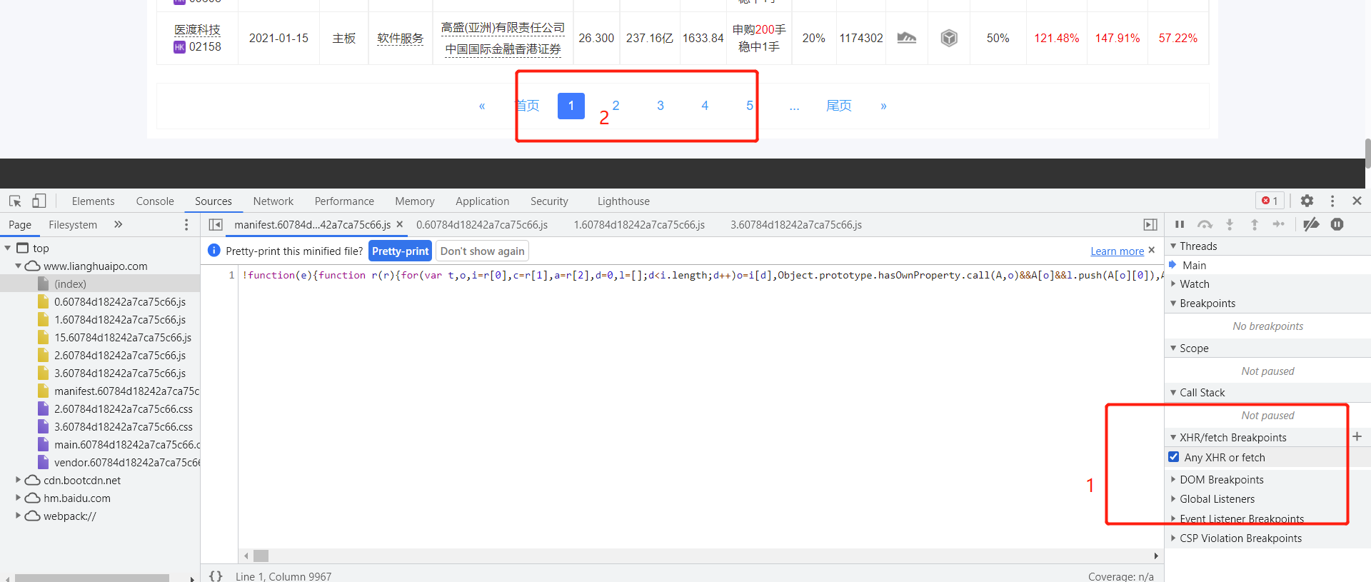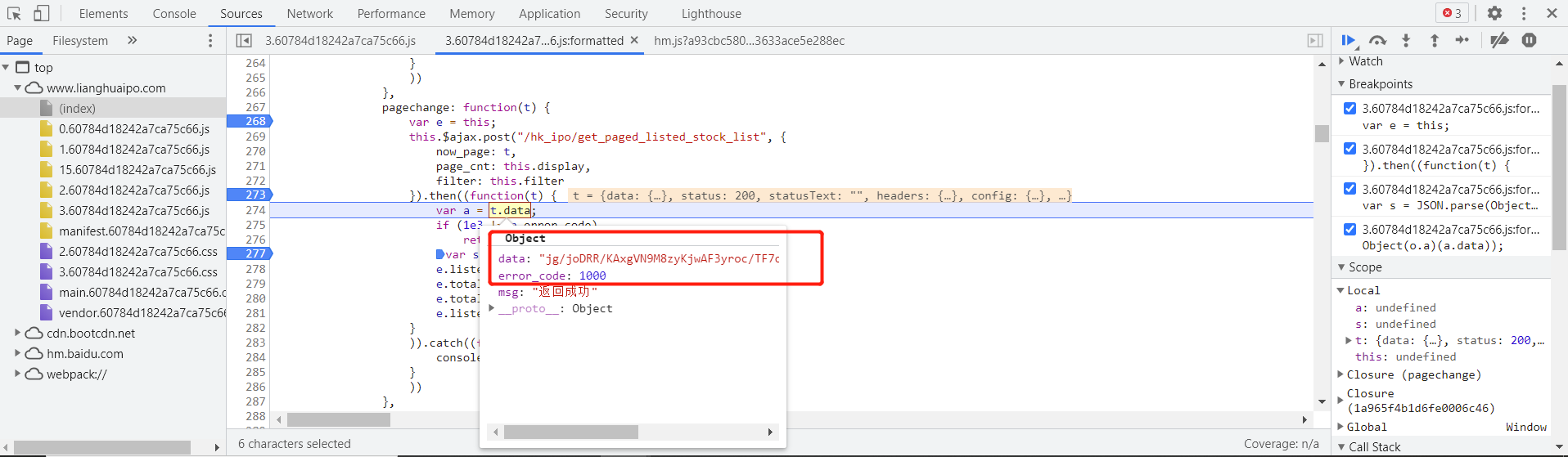 网页被断住,向上找堆栈,到pagechange发现有个JSON.parse这不就是解密点?打个断点,放开xhr断点,在进行一次翻页