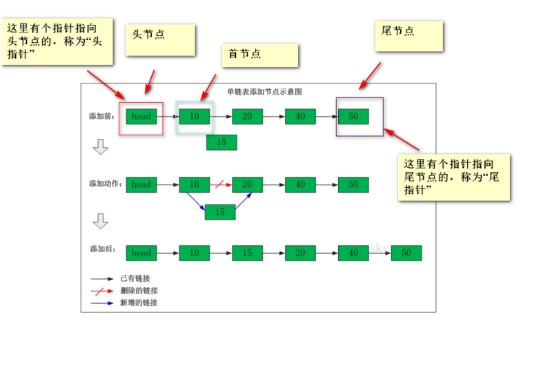 //向链表中添加数据 public static void addData(int value){ //初始化要加入的节点 Node newNode=new Node(value); //临时节点 Node temp=head.next; //找到尾节点 while(temp!=null){ temp=temp.next; } temp.next=newNode; }