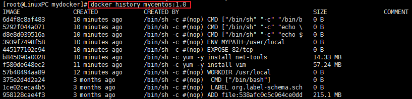 4,查看镜像的变更历史,docker history 镜像名:TAG