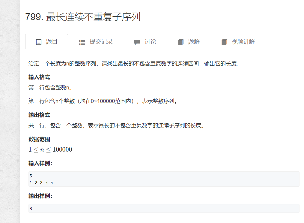 #include<iostream> using namespace std; const int N = 1000010; int n; int a[N]; int cnt[N]; int main(){ int res = 0; scanf("%d",&n); for(int i = 0 ; i < n ; i ++ ) scanf("%d",&a[i]); for(int i = 0, j = 0 ; i < n ; i ++ ){ cnt[a[i]]++; while( cnt[a[i]] > 1 ){ cnt[a[j]]--; j++; } res = max(res , i - j + 1); } printf("%d\n",res); return 0; }