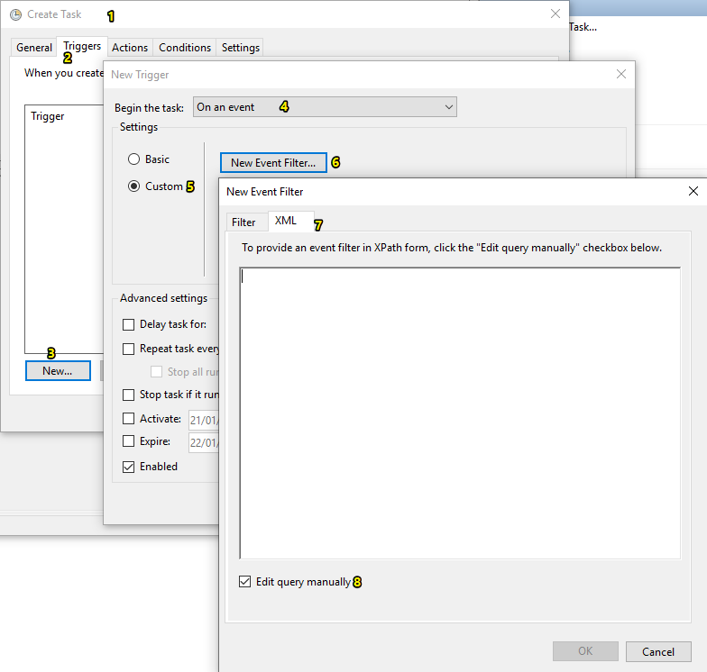 粘贴以下XML代码, 记得把其中的'Your Task Name'改成你自己的原始任务名称,这里需要注意一下,任务名称需要包含路径,例如我的任务放在AutoPy文件夹下,名字是test,这里的名称就应该是\AutoPy\test.