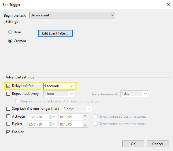 <QueryList> <Query Id="0" Path="Microsoft-Windows-TaskScheduler/Operational"> <Select Path="Microsoft-Windows-TaskScheduler/Operational"> *[System[EventID=201]] and *[EventData[Data[@Name='ResultCode']!='0']] and *[EventData[Data[@Name='TaskName']='Your Task Name']] </Select> </Query> </QueryList>