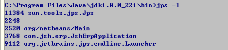 比如当执行了JshErpApplication启动类中的main方法后(main方法持续执行),执行 jps -l可看到下面的JshErpApplication类的pid为3768,
