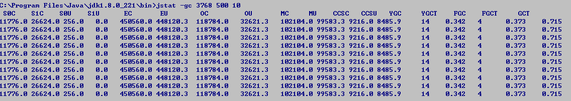 jstat -gc [pid] 500 10 :每500毫秒打印一次Java堆状况(各个区的容量、使用容量、gc时间等信息),打印10次