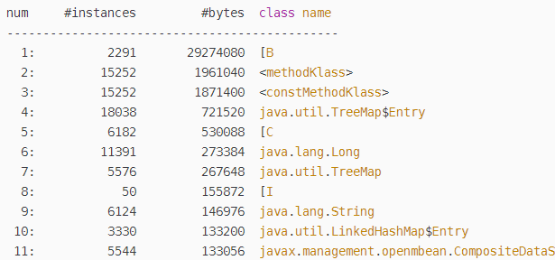 执行jmap -histo [pid]可以打印出当前堆中所有每个类的实例数量和内存占用,