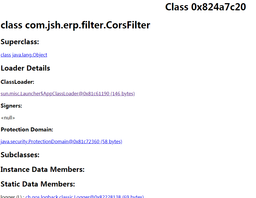 在控制台可以看到服务器启动了,访问 http://127.0.0.1:9810/ 可以看到对快照中的每个类进行分析的结果(界面略low),下图是我随便选择了一个类的信息,有这个类的父类,加载这个类的类加载器和占用的空间大小,下面还有这个类的每个实例(References)及其内存地址和大小,点进去会显示这个实例的一些成员变量等信息: