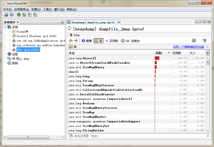 jvisualvm也可以分析内存快照,在jvisualvm菜单的“文件”-“装入”,选择堆内存快照,快照中的信息就以图形界面展示出来了,