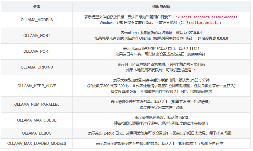 OLLAMA_DEBUG 表示输出 Debug 日志,应用研发阶段可以设置成1 (即输出详细日志信息,便于排查问题)