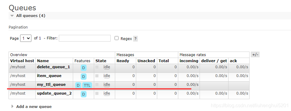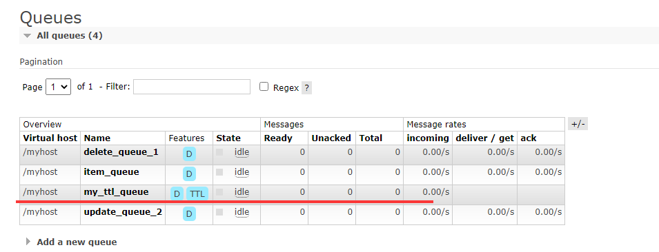 消息发送之后rabbit的控制台我们可以看到会新增一个消息队列,并且我们可以看到队列中消息从0变成1后,在过期时间之后又从1变为0。