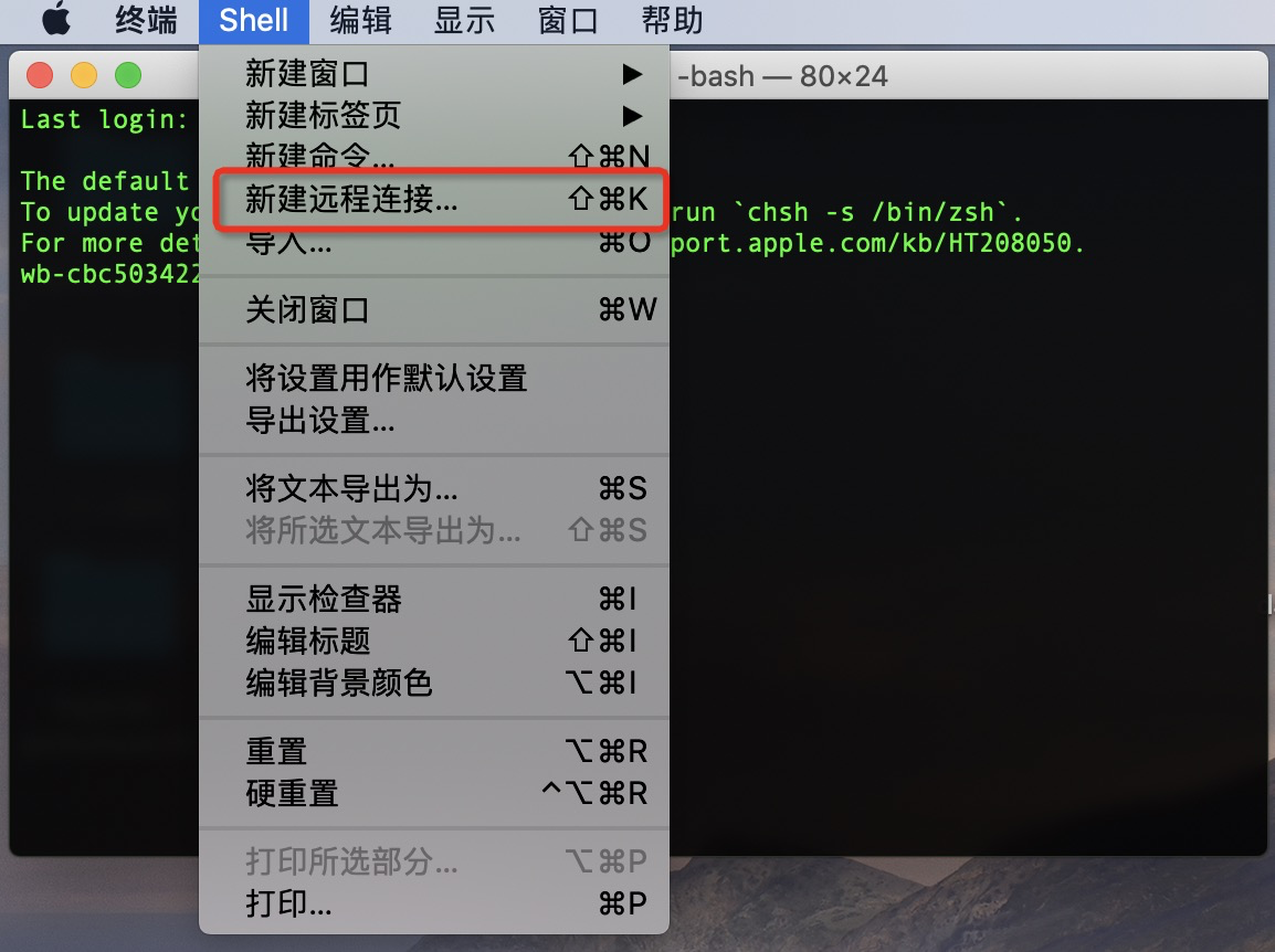 第二步:在终端的Shell菜单中选择新建远程连接,或者在程序坞中右键终端图标,选择新建远程连接