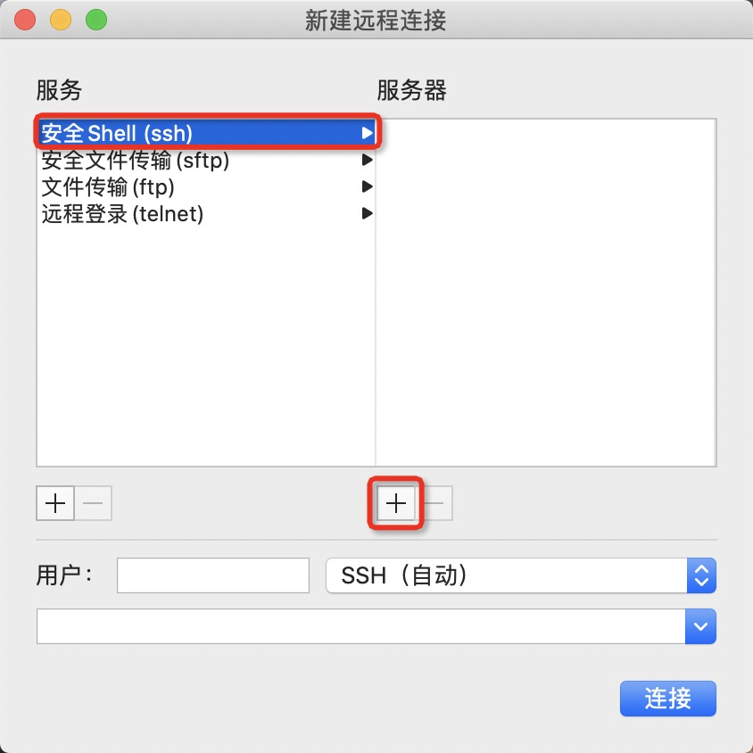 第三步:当点击了新建远程连接之后会出现一个弹出框,选择 安全Shell(ssh)然后点击右边服务器下面的加号