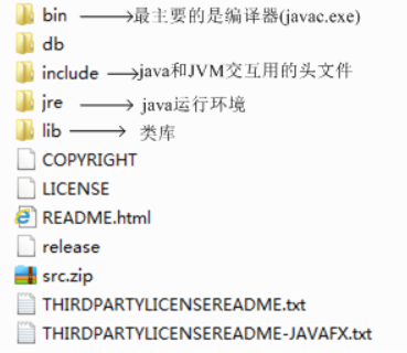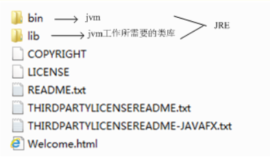 下图是JRE的安装目录:里面有两个文件夹bin和lib,在这里可以认为bin里的就是jvm,lib中则是jvm工作所需要的类库,而jvm和 lib和起来就称为jre。