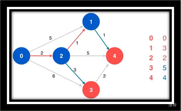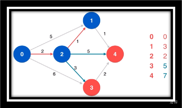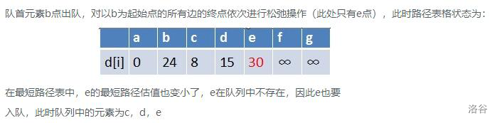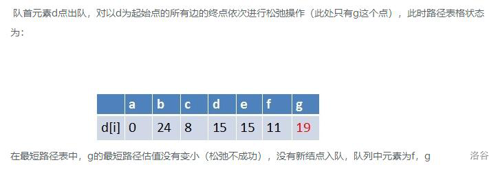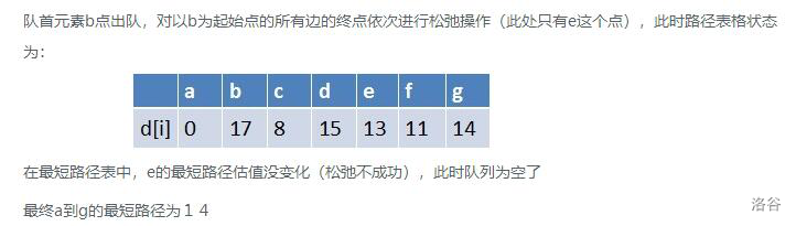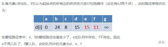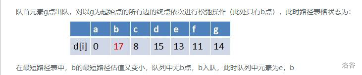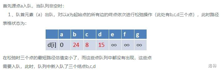 - 算法实现:它采用了队列和松弛技术。先将源点加入队列。然后从队列中取出一个点(此时该点为源点),对该点的邻接点进行松弛,如果该邻接点松弛成功且不在队列中,则把该点加入队列。如此循环往复,直到队列为空,则求出了最短路径