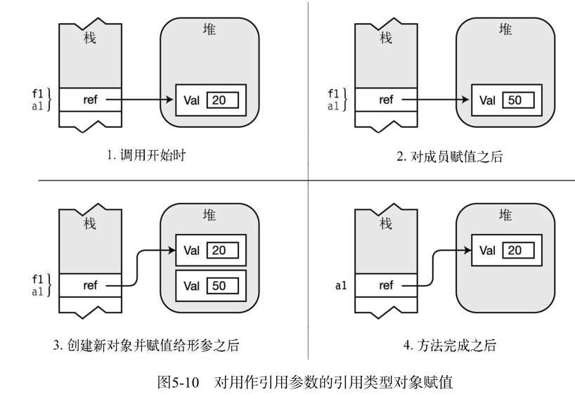 class MyClass{public int Val=20;} class Program { static void RefAsParameter(ref MyClass f1) { f1.Val=50; Console.WriteLine("After meber assignment:{0}",f1.Val); f1=new MyClass(); Console.WriteLine("After new object creation:{0}",f1.Val); } static void Main(string[] args) { MyClass a1=new MyClass(); Console.WriteLine("Before method call:{0}",a1.Val); RefAsParameter(ref a1); Console.WriteLine("After method call:{0}",a1.Val); } }