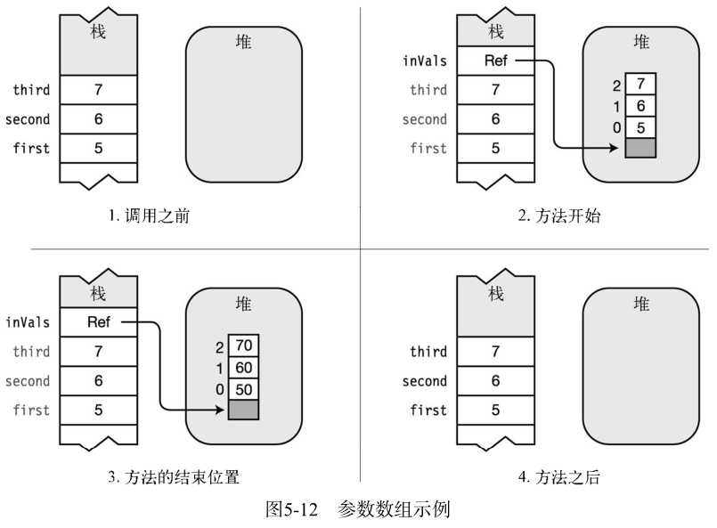 - 方法开始,3个实参被用于初始化堆中的数组,并且数组的引用被赋值给形参inVals