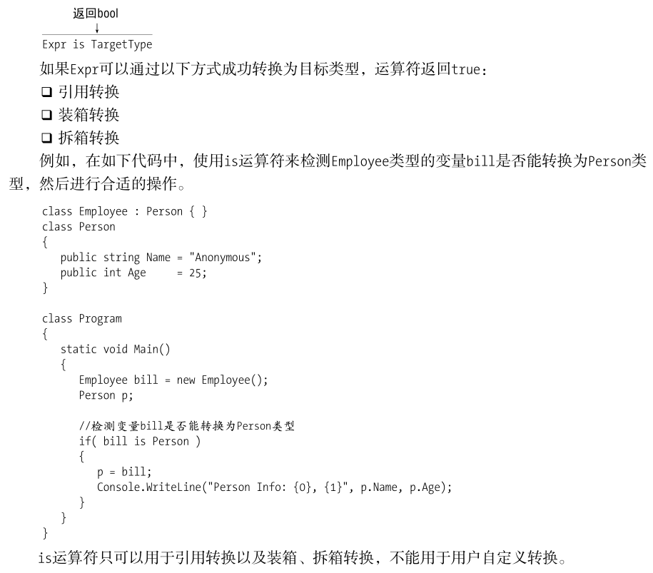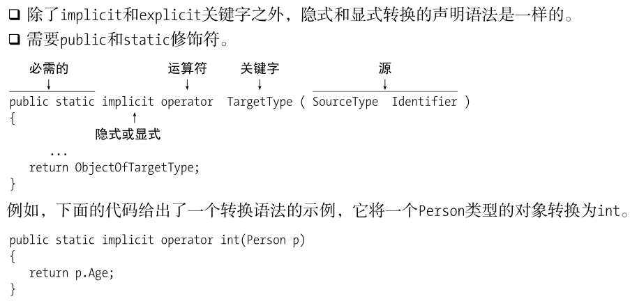 class Person{ public string Name; public int Age; public Person(string name,int age) { Name = name; Age = age; } public static implicit operator int(Person p) { return p.Age; } public static implicit operator Person(int i) { return new Person("Nemo",i); } class Program{ static void Main(){ Person bill = new Person("bill",25); } //把Person对象转换为Int int age = bill; Console.WriteLine($"Person Info :{bill.Name},{age}"); //把int转化为Person对象 Person anno = 35; Console.WriteLine($"Person Info {anno.Name} ,{anno.Age}") } //输出结果: Person Info:bill,25 Person Info Nemo,35