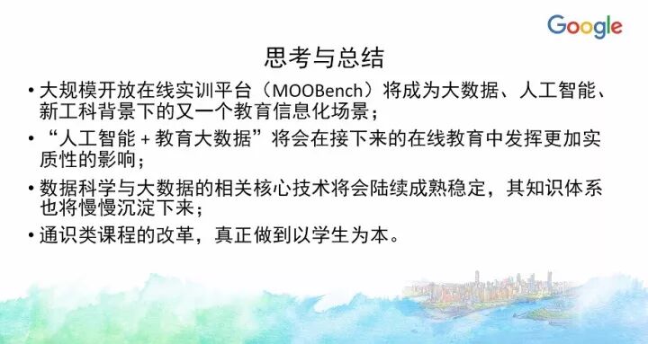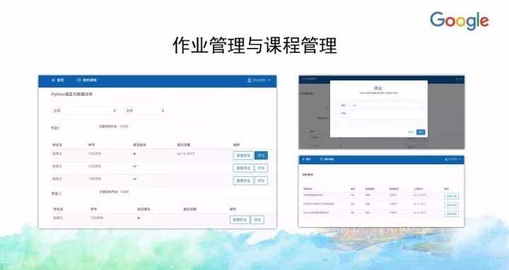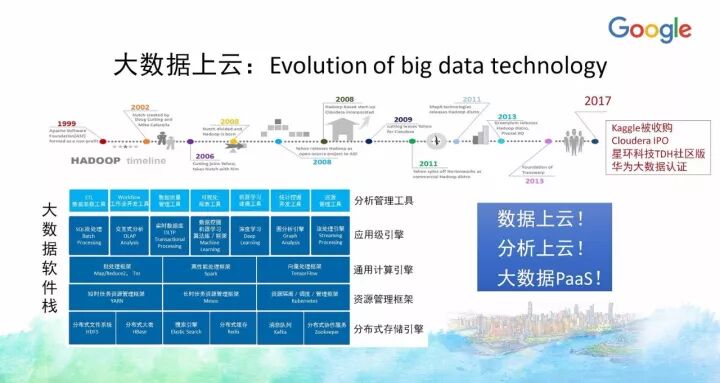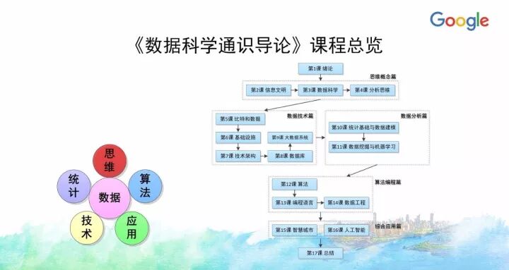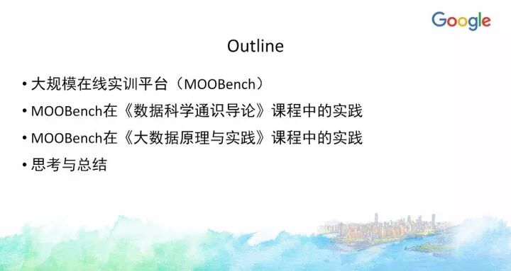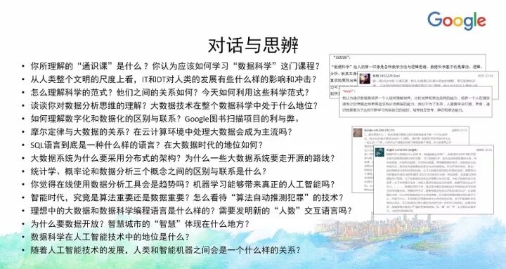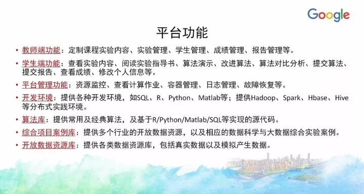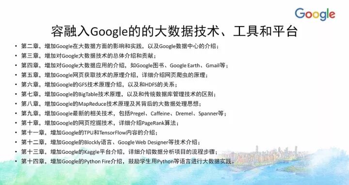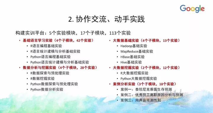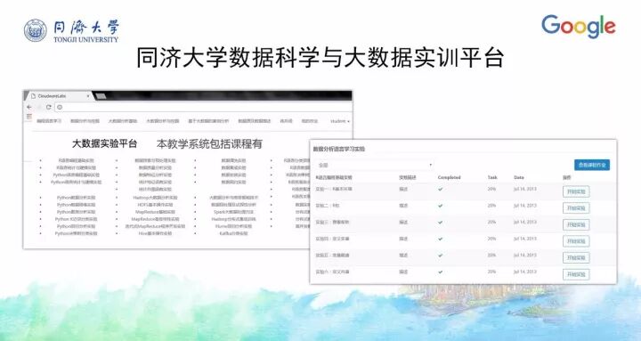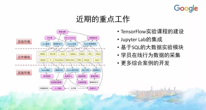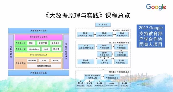 另外一门课《大数据原理与实践》今年也入选了Google支持教育部产学合作协同育人项目,目前正在建设中。当时申请的时候融入了很多Google的的大数据技术、工具和平台,实际上今天大数据整个知识体系所慢慢沉淀下来的内容很多都确实来自Google公司的技术与开源项目等,像HDFS、MapReduce、BigTable等,以及新的大数据应用方面,像TensorFlow等。
