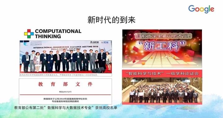 当我们还没来得及推广计算思维的时候,大数据时代的分析思维就来了;当我们还在庆祝中国被接纳为《华盛顿协议》正式签约成员,开始履行专业工程认证工作的时候,新工科的概念就提出来了,对传统工程专业人才培养提出了挑战;当我们还在申请、正在建设数据科学与大数据技术专业的时候,“智能科学与技术”一级学科申请的工作已经开始竟罗密鼓的筹备了,新的人工智能一级学科呼之欲出。