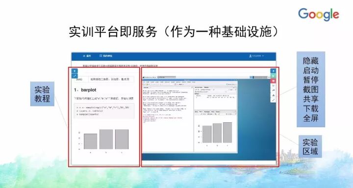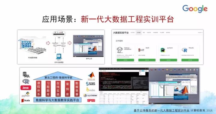 就大数据场景来说,通过将传统桌面软件和大数据软件进行云端化,使得用户通过浏览器就可以方便使用各种Matlab,R、SQL、Python、Hadoop、Spark等实训环境,节约了机房场地及试验设备,丰富了教学形式,简化了教学过程,提供了便捷高效的工程实践环境。从根本上改变目前桌面软件(例如Matlab、SPSS)和分布式大数据软件(如Hadoop、Spark)的实训方式,使得用户直接仅仅通过浏览器就可以访问这些软件服务或编程环境,将大数据实训的各个环节连接到一起,最终做到大数据工程实训服务的触手可及、随时可用、秒级启动、用完即走;也使得能够很容易采集到实训学员的实践行为大数据,也为后续教育大数据提供了一个好的样例数据。