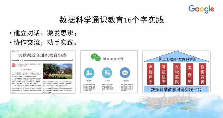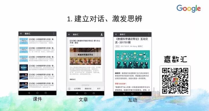 简单来说十六个字:建立对话;激发思辨;协作交流;动手实践。这里,我们借助了两个平台:微信公众号平台(微信号:Datahui)和前面提到的实训平台。