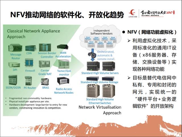 NFV我相信大家可能在IT领域做得比较多,在网络这一侧可能知道一些,但不一定很关注。对运营商来讲,现在NFV全称就是网络功能虚拟化,这一块是非常关注的一个要点。