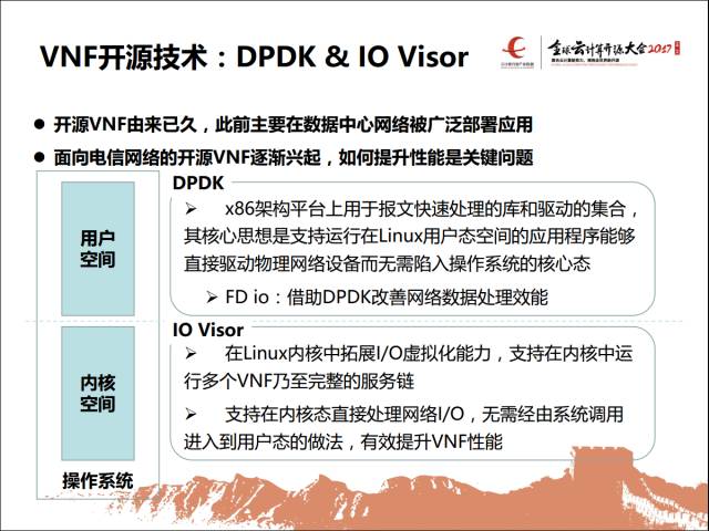 下面说的是虚拟化,如果针对每一个虚拟的网元,这上面主要讲几个,现在主流的还是X86和他的虚拟化,但X86本身并不是为网络运行的应用准备的,我拿它来承载网络密集型就不够用了。这里面列举两个比较典型的,一个DPDK,一个IO Visor。
