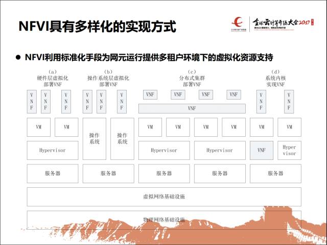 先讲NFVI,承载虚拟化的方式。这个很多种方式的,我大概总结了几个,比如第一种首先我把这个功能部署到一个虚机里,这个活其实现在很多的原来的硬件网元的设备厂商都这么做的,原来拿硬件实现这个功能,现在软件化,软件化之后移入到X86虚机,X86虚机现在跟物理机性能上的差别也差不多了,这个迁移是很容易的。