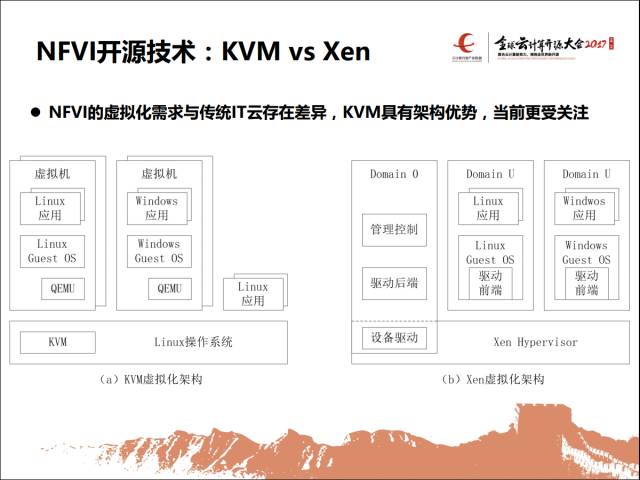在Xen里面,计算内存这些东西都还好办,Xen是两种,一种是半虚拟化,一种是全虚拟化,不管是哪种方式,处理IO的时候,把它的请求放到整个体系里,放到Domain 0来做。我们看到一些主流厂商,他们在面向VNF这一块,他们都会用KVM的架构来做这个事情。包括我们在内部的测试,下面都是以KVM为主。