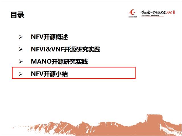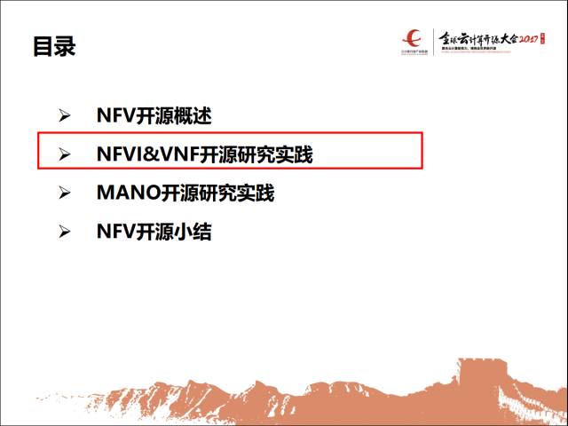 大概四部分,先是有开源概述,然后给大家分几个层面介绍NFVI,就是网络功能虚拟化的基础设施,还有VNF网络功能的开源方面,还有MANO,管理和编排相关的开源技术的体系,最后是开源小结。