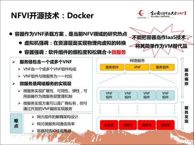 再说到操作系统虚拟化,最典型的现在在说的是Docker,在这要强调一个事,Docker不等同于虚拟机。我们希望看到容器面向的应该是微服务,首先你要能先把你的这个网元给他的功能变得微服务化之后,你把每一个微服务做成容器化的承载。把网元整体功能从物理机变成虚拟机再变成一个容器,从我的角度来讲是不认可的。