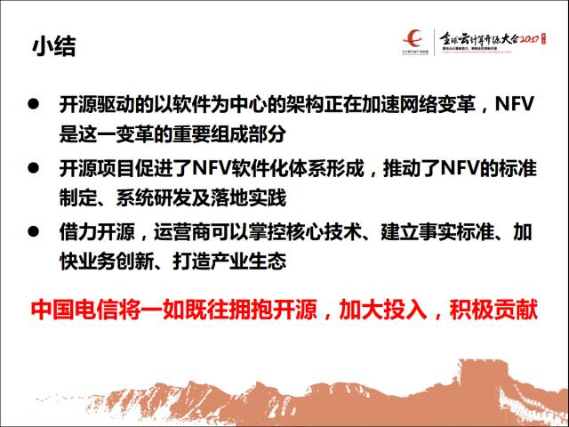 最后是小结。大家都在谈开源,开源对于运营商来讲,特别对运营商来讲,真的是一个双刃剑,好处可能在于降低门槛,坏处在于开源是相对松散的社区在组织推进的。