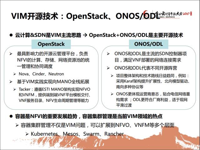 ONOS和ODL现在都是主流的SDN控制器项目,满足VNF部署的网络连接需求。ONOS和ODL代表不同开源阵营。容器是NFVI的重要发展趋势,容器集群管理是当前VIM领域的热点。容器集群管理不仅是VIM问题,可以扩展到NFVO、VNFM等多个层面,这里面有kubernetes、Mesos、Swarm、Rarcher。