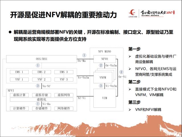 另外一块,运营商本身运营支撑平台OSS这块跟他解耦,原来是有标准结构的,所以这块也是一种解耦的,这是一步已经做到的。第二步这两个地方是有希望揭开的,比如说SDO这个编排器和业务相关的,运营商会根据业务的发展方向和规划提出规范,希望厂商去适配我们。第三个最难的体现在这个地方,刚才提到设备对性能的追求是无止境的,尤其是网络IO也是对传统的IT要求负责高的。