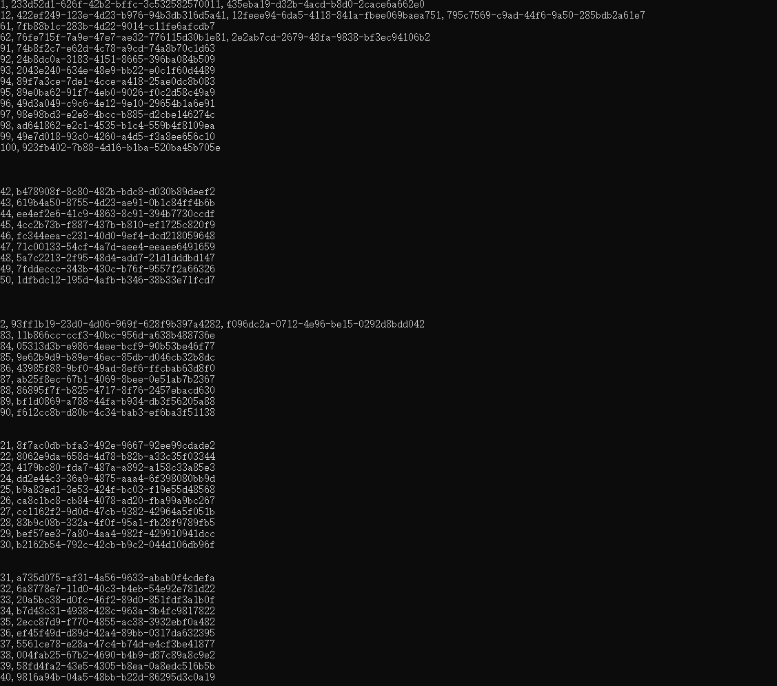 #pragma comment(lib,"rpcrt4.lib") #include <Windows.h> #include <rpcdce.h> #include <iostream> #include <string> #include <thread> #include <vector> using namespace std; string getUuid() { RPC_CSTR rpcCstr; string uuidValue; UUID newUUID; UuidCreate(&newUUID); UuidToStringA(&newUUID, &rpcCstr); uuidValue = (char*)rpcCstr; RpcStringFreeA(&rpcCstr); return uuidValue; } void printVector(const vector<string>& vec) { for (const auto& str : vec) { cout << str << endl; } cout << endl << endl; } uint32_t num = 0; void vectorDemo() { vector<vector<string>> vec(10); for (int i = 0; i < 10; i++) { for (int j = 0; j < 10; j++) { string tempStr = std::to_string(++num) + ","+getUuid(); vec[i].push_back(tempStr); } } thread tArr[10]; for (int i = 0; i < 10; i++) { tArr[i] = thread(printVector, std::ref(vec.at(i))); } for (int i = 0; i < 10; i++) { tArr[i].join(); cout << "Thread " << i << " finished!" << endl; } } int main() { vectorDemo(); cin.get(); }