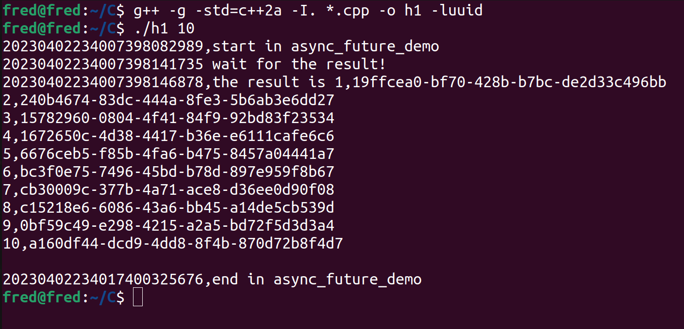 #include <chrono> #include <ctime> #include <future> #include <iomanip> #include <iostream> #include <sstream> #include <string> #include <unistd.h> #include <uuid/uuid.h> std::string get_time_now() { std::chrono::time_point<std::chrono::high_resolution_clock> now = std::chrono::high_resolution_clock::now(); time_t raw_time = std::chrono::high_resolution_clock::to_time_t(now); struct tm tm_info = *localtime(&raw_time); std::stringstream ss; std::chrono::seconds seconds = std::chrono::duration_cast<std::chrono::seconds>(now.time_since_epoch()); std::chrono::milliseconds mills = std::chrono::duration_cast<std::chrono::milliseconds>(now.time_since_epoch()); std::chrono::microseconds micros = std::chrono::duration_cast<std::chrono::microseconds>(now.time_since_epoch()); std::chrono::nanoseconds nanos = std::chrono::duration_cast<std::chrono::nanoseconds>(now.time_since_epoch()); ss<<std::put_time(&tm_info,"%Y%m%d%H%M%S") <<std::setw(3)<<std::setfill('0')<<std::to_string(mills.count()-seconds.count()*1000) <<std::setw(3)<<std::setfill('0')<<std::to_string(micros.count()-mills.count()*1000) <<std::setw(3)<<std::setfill('0')<<std::to_string(nanos.count()-micros.count()*1000); return ss.str(); } char* uuid_value=(char*)malloc(40); char* get_uuid() { uuid_t new_uuid; uuid_generate(new_uuid); uuid_unparse(new_uuid,uuid_value); return uuid_value; } std::string get_num_and_uuid(const int&len) { std::stringstream ss; for(int i=0;i<len;i++) { ss<<i+1<<","<<get_uuid()<<std::endl; sleep(1); } return ss.str(); } void async_future_demo(const int &len) { std::cout<<get_time_now()<<",start in "<<__FUNCTION__<<std::endl; std::future<std::string> fut=std::async(get_num_and_uuid,std::cref(len)); std::cout<<get_time_now()<<" wait for the result!"<<std::endl; std::cout<<get_time_now()<<",the result is "<<fut.get()<<std::endl; std::cout<<get_time_now()<<",end in "<<__FUNCTION__<<std::endl; } int main(int args,char **argv) { async_future_demo(atoi(argv[1])); }