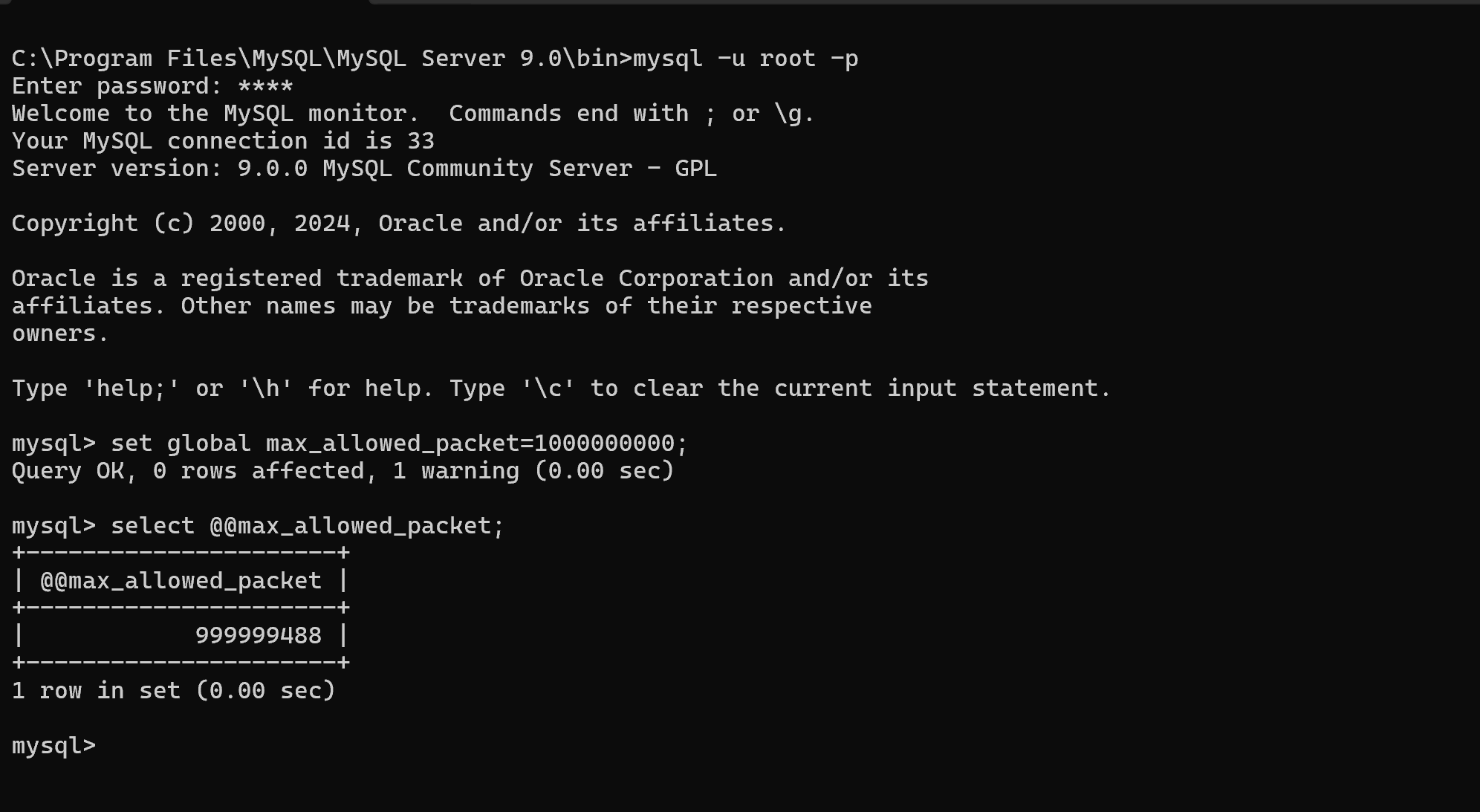 1.cd C:\Program Files\MySQL\MySQL Server 9.0\bin; 2.mysql -u root -p enter password as prompted; 3.set global max_allowed_packet=1000000000; select @@max_allowed_packet;
