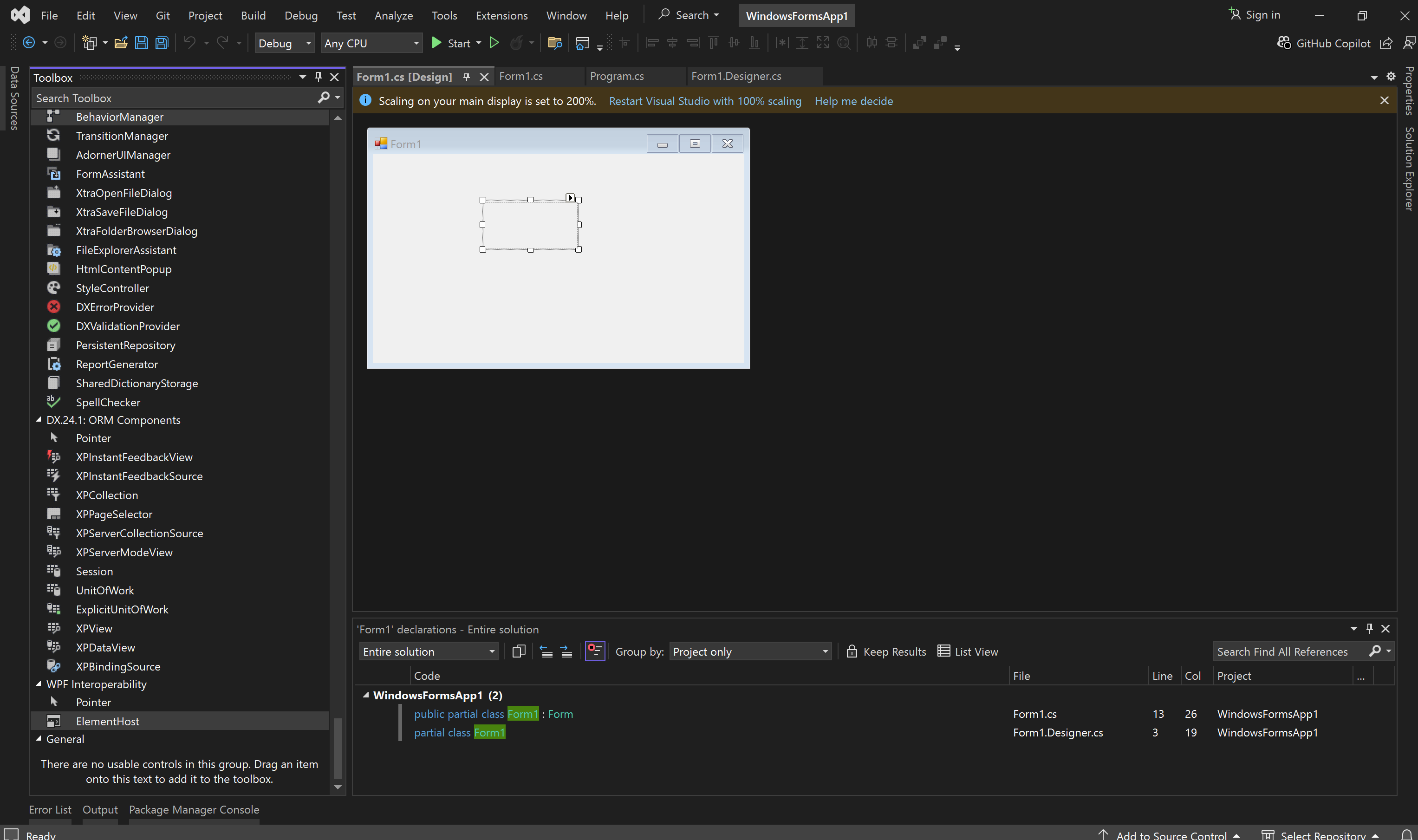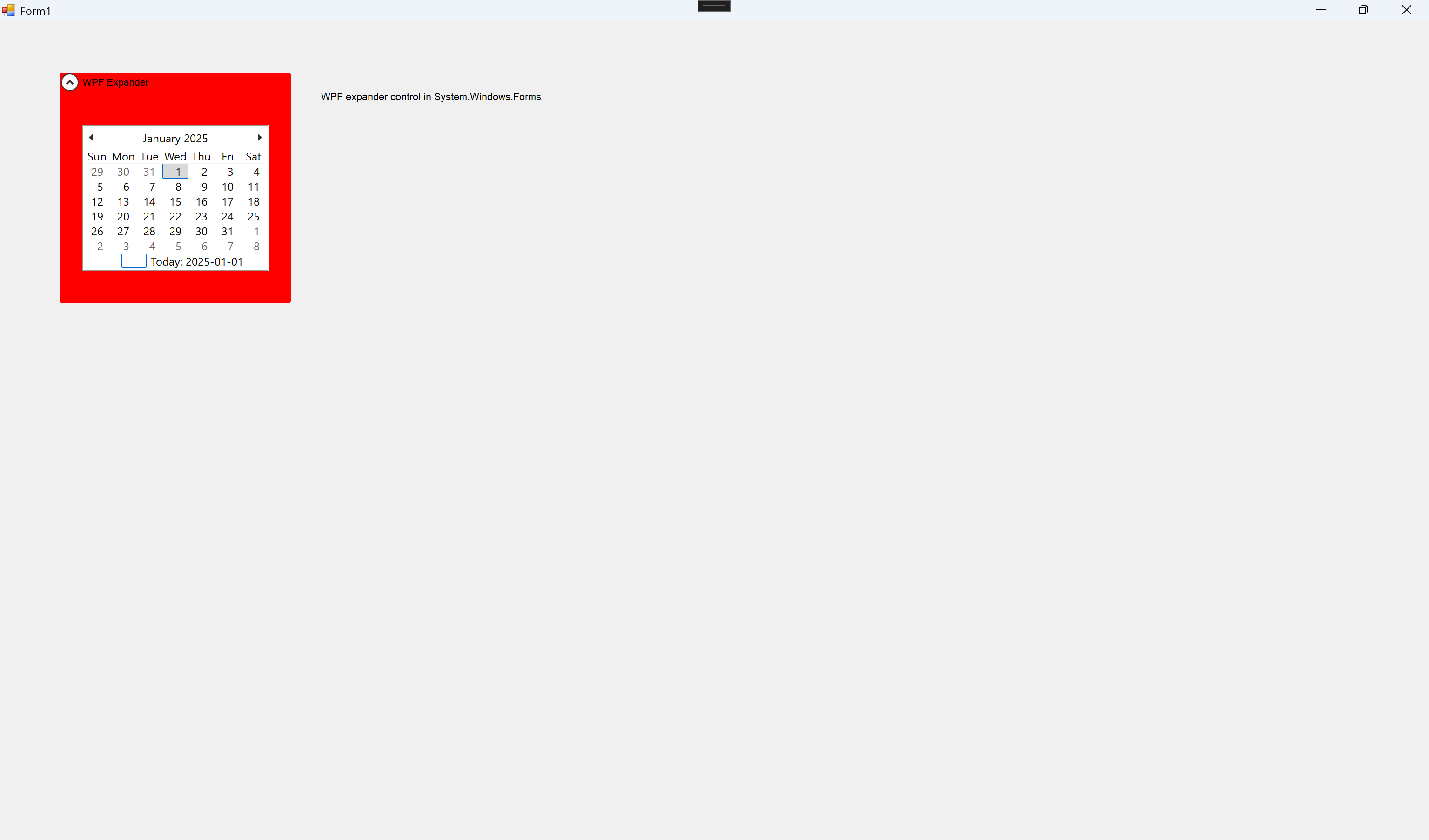 using System; using System.Collections.Generic; using System.ComponentModel; using System.Data; using System.Drawing; using System.Linq; using System.Text; using System.Threading.Tasks; using System.Windows.Controls; using System.Windows.Forms; using System.Windows.Forms.Integration; using System.Windows.Media; namespace WindowsFormsApp1 { public partial class Form1 : Form { public Form1() { InitializeComponent(); Expander expander = new Expander(); expander.Background = new SolidColorBrush(System.Windows.Media.Color.FromRgb(255,0,0)); expander.Header = "WPF Expander"; WindowsFormsHost host = new WindowsFormsHost(); host.Child = new MonthCalendar(); expander.Content = host; label1.Text = "WPF expander control in System.Windows.Forms"; elementHost1.Child= expander; } } }