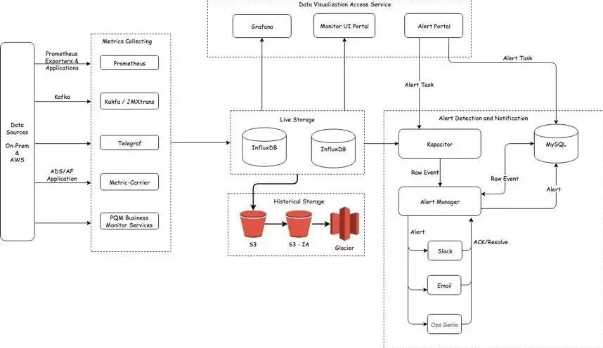 经过如上处理,各个数据源关于同一个事件的多个报警通过机器学习的模型分析汇聚成一个报警,避免了报警风暴造成的困扰,使运维人员可以快速准确地定位到问题。OpsGenie 再触发流程及时通知相关技术响应人员,处理报警的效率就会很高。这样优化后的监控体系架构如下图所示: