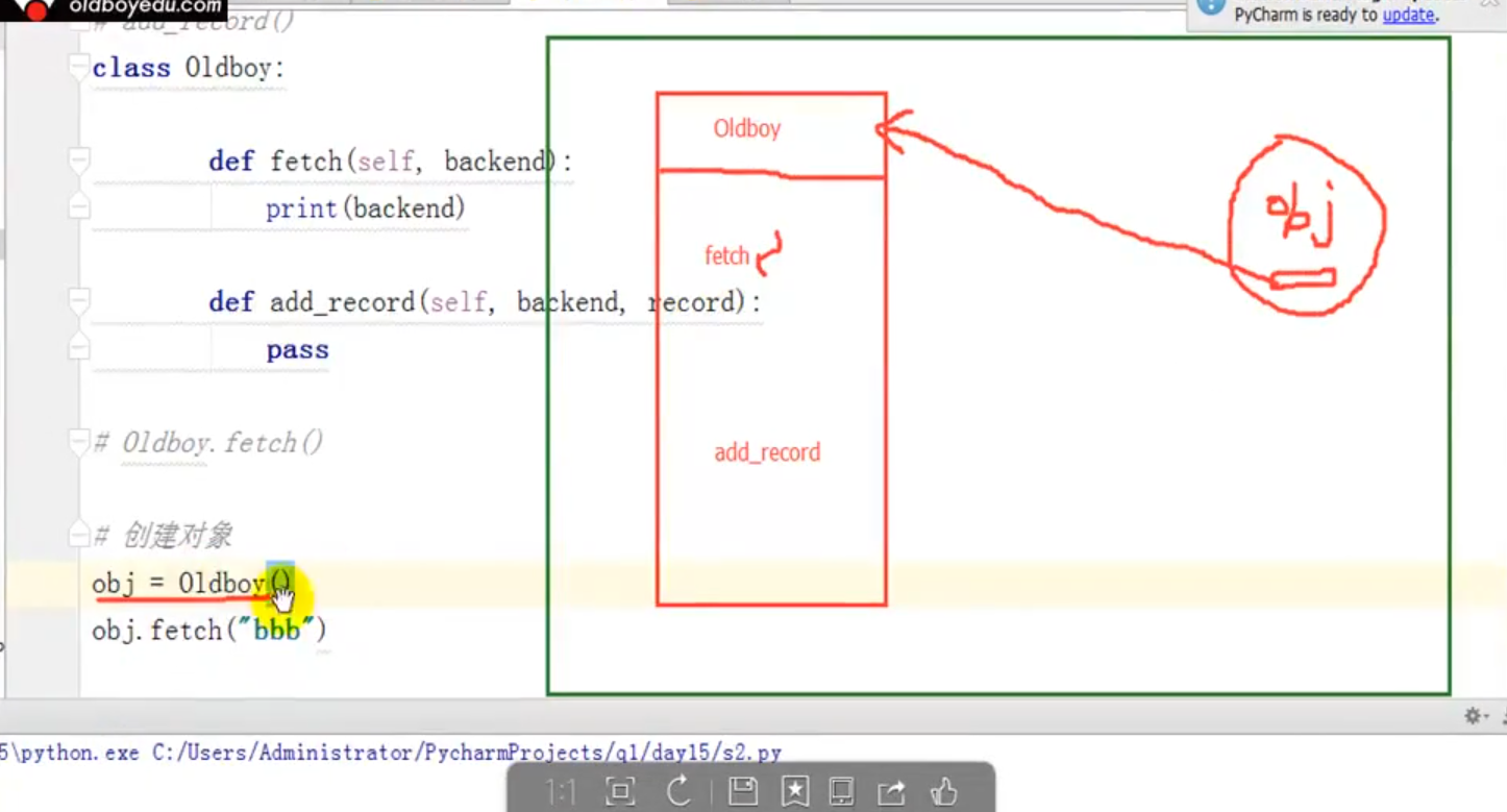 1 class oldboy: #创建类oldboy 2 def fetch (self, backend): #定义方法 3 print() 4 5 def add_record (self, backend, record):#定义方法 6 pass 7 8 obj = oldboy() #根据类创建对象 9 obj.fetch() #使用对象去执行类中的方法 10 obj.add_record()
