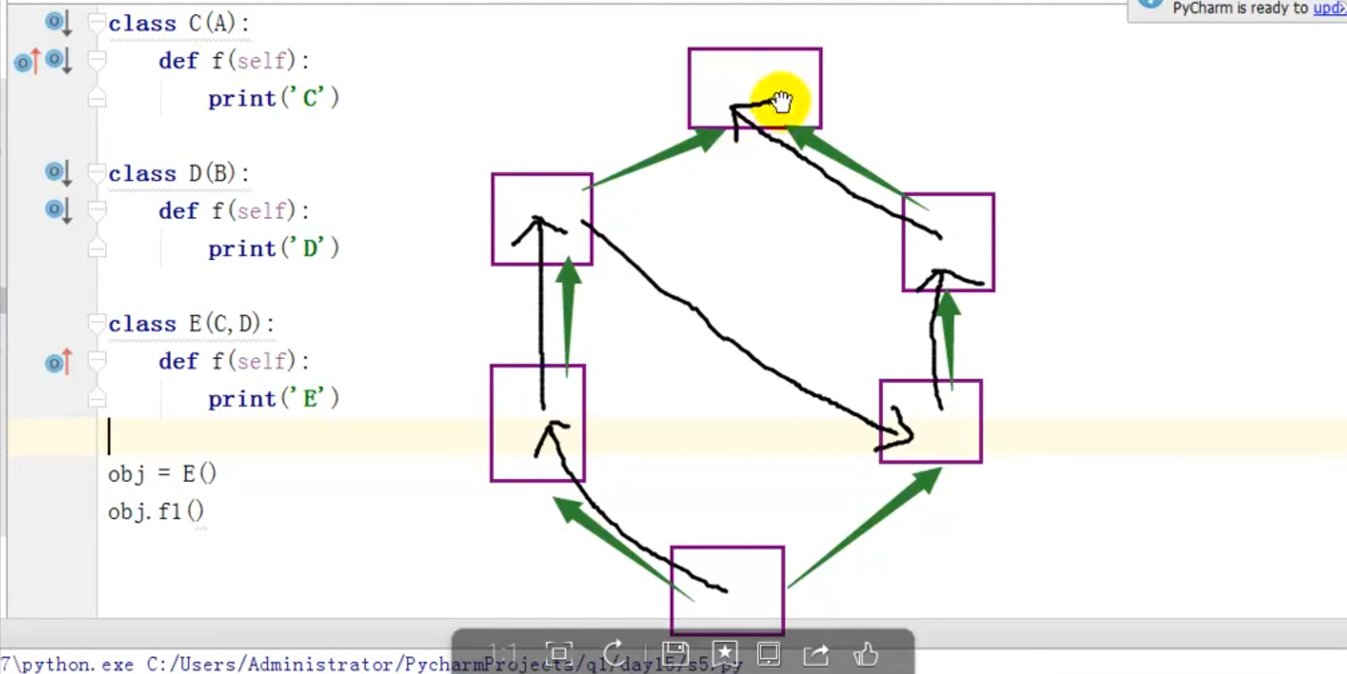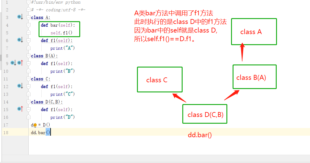 1 class A: 2 def bar(self): 3 self.f1() 4 def f1(self): 5 print("A") 6 class B(A): 7 def f1(self): 8 print("B") 9 class C: 10 def f1(self): 11 print("C") 12 class D(C,B): 13 def f1(self): 14 print("D") 15 dd = D() 16 dd.bar()