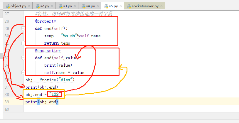 1 class Provice: 2 #静态字段,在类中:将对象中存在多份一样的内容,放在类中,即静态字段 3 country = "China" 4 def __init__(self,name): 5 #普通字段,在对象中 6 self.name = name 7 #普通方法,类中 8 def show(self): 9 print("show") 10 #类方法,必须有一个参数, 11 @classmethod 12 def xxoo(cls): 13 print("xxoo") 14 #静态方法 15 @staticmethod 16 def xo(): 17 print("xo") 18 def start(self): 19 temp = "%s sb"%self.name 20 return temp 21 #特性,访问时将方法伪造成一种字段 22 @property 23 def end(self): 24 temp = "%s sb"%self.name 25 return temp 26 @end.setter 27 def end(self,value): 28 print(value) 29 self.name = value 30 obj = Provice("Alex") 31 print(obj.end) 32 obj.end = "123" 33 print(obj.end)
