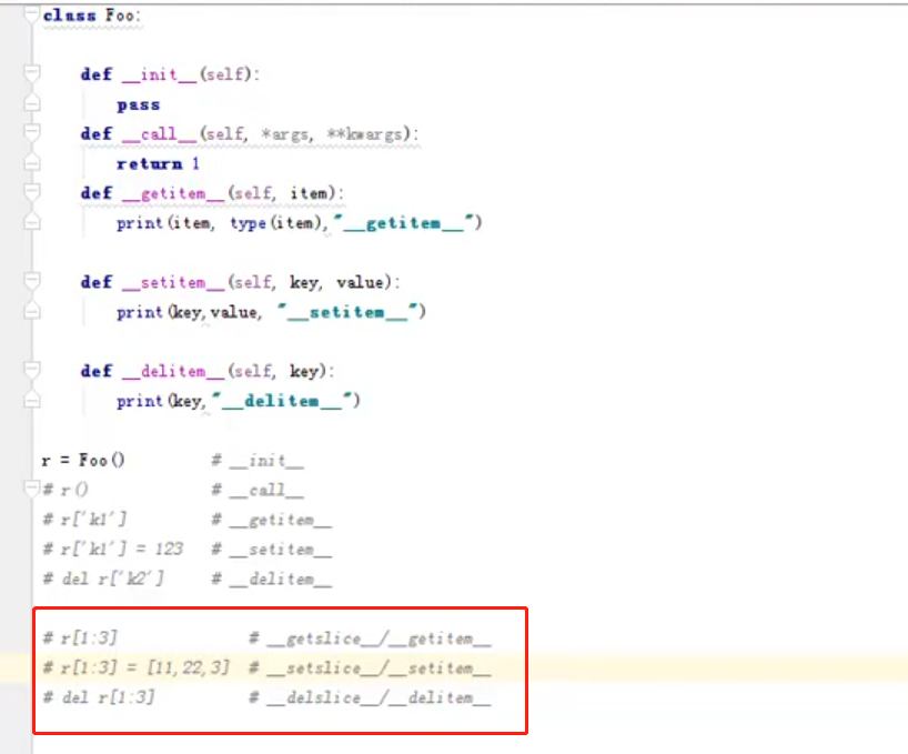 1 class Foo: 2 def __init__(self): 3 print("init") 4 5 def __call__(self, *args, **kwargs): 6 print("call") 7 8 def __getitem__(self, item): 9 print(item) 10 r = Foo() 11 r()#调用__call__ 12 Foo()()#调用__call__ 13 r["k1"] #中括号执行__getitem__方法。
