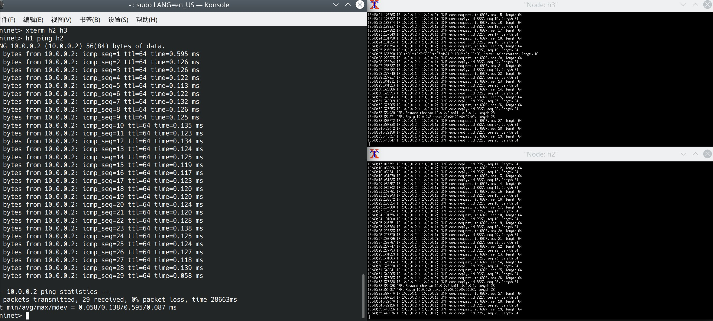 1. 搭建下图所示SDN拓扑,协议使用Open Flow 1.0,控制器使用部署于本地的POX(默认监听6633端口)