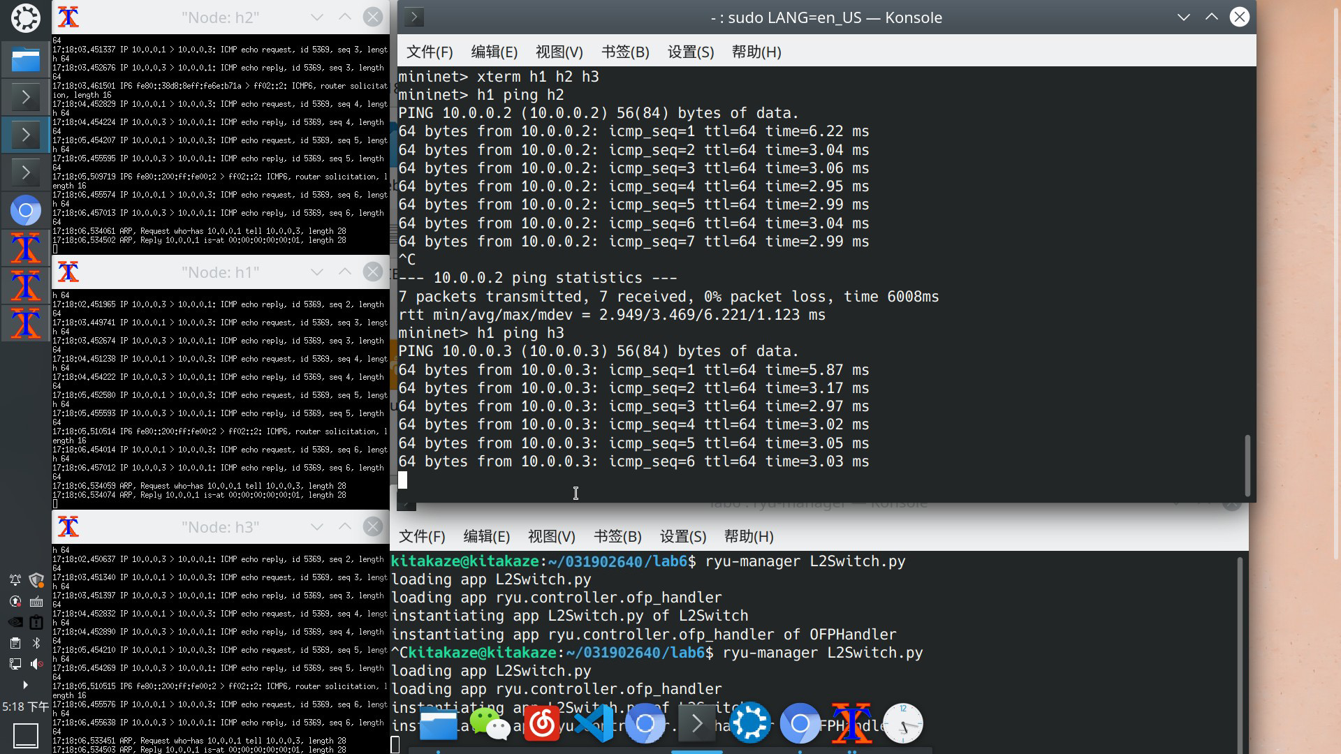 4.阅读Ryu文档的The First Application一节,运行并使用 tcpdump 验证L2Switch,分析和POX的Hub模块有何不同。