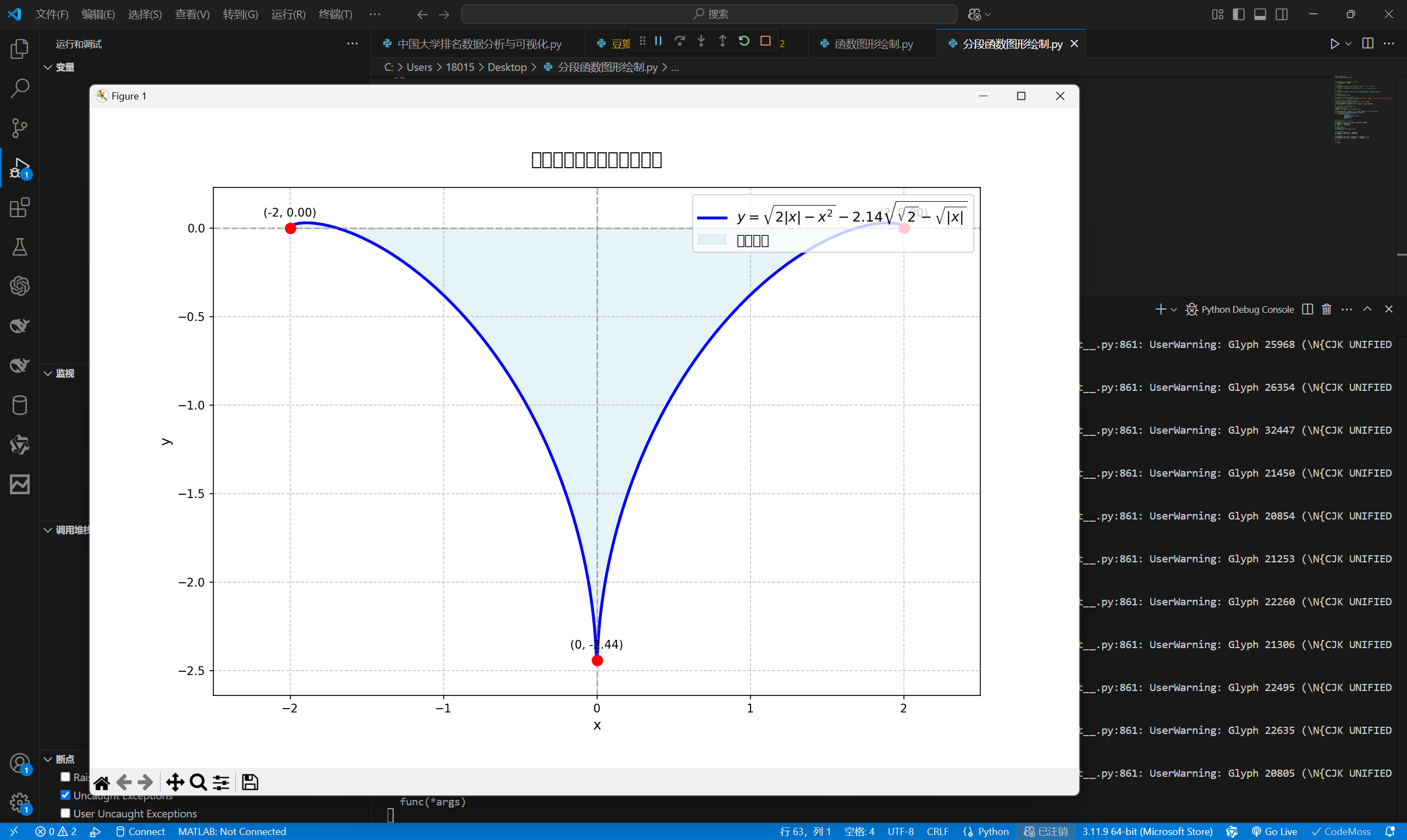 y = np.sqrt(2 * np.abs(x) - x**2) - 2.14 * np.sqrt(np.sqrt(2) - np.sqrt(np.abs(x)))